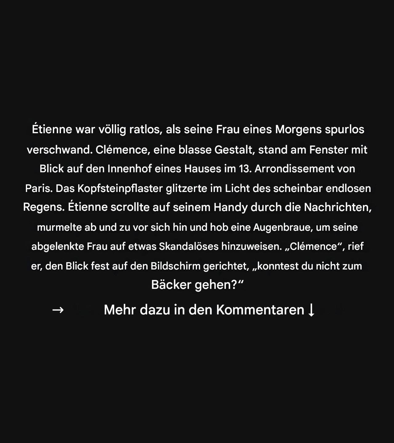 Clémence, die blasse Silhouette, blieb vor dem Fenster stehen, das noch vor der Tür des 13. Pariser Arrondissements stand. Les Pavés luisaient sous une pluie fine and endless.